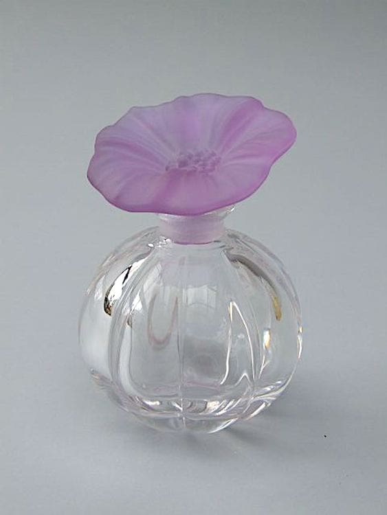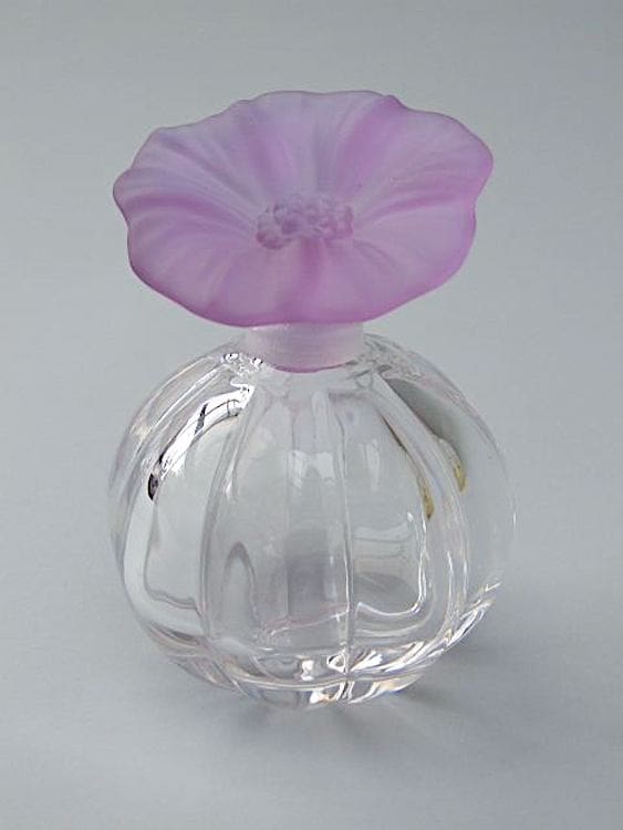 Clear Czech glass contemporary scent bottle with a purple flower shaped stopper.