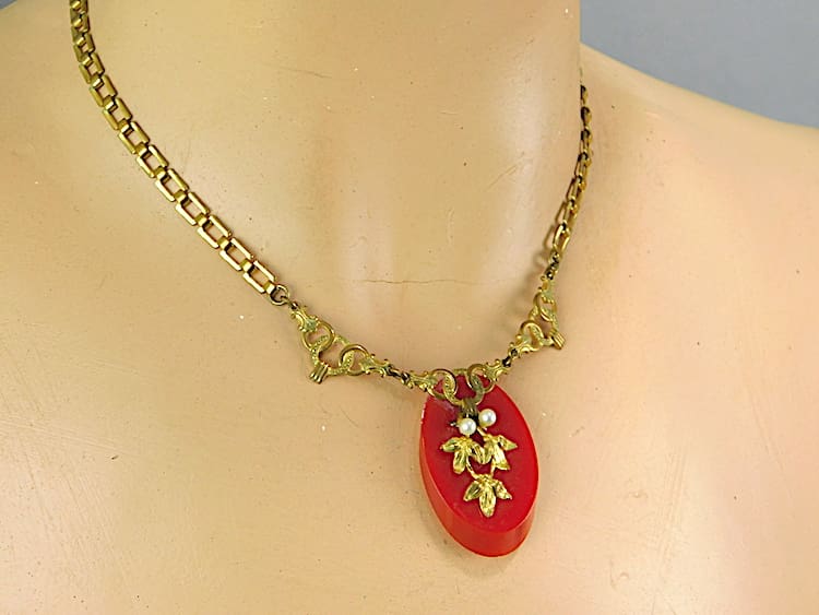 Art Deco floral filigree necklace with a red phenolic back panel.