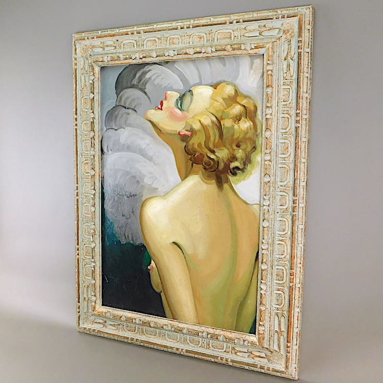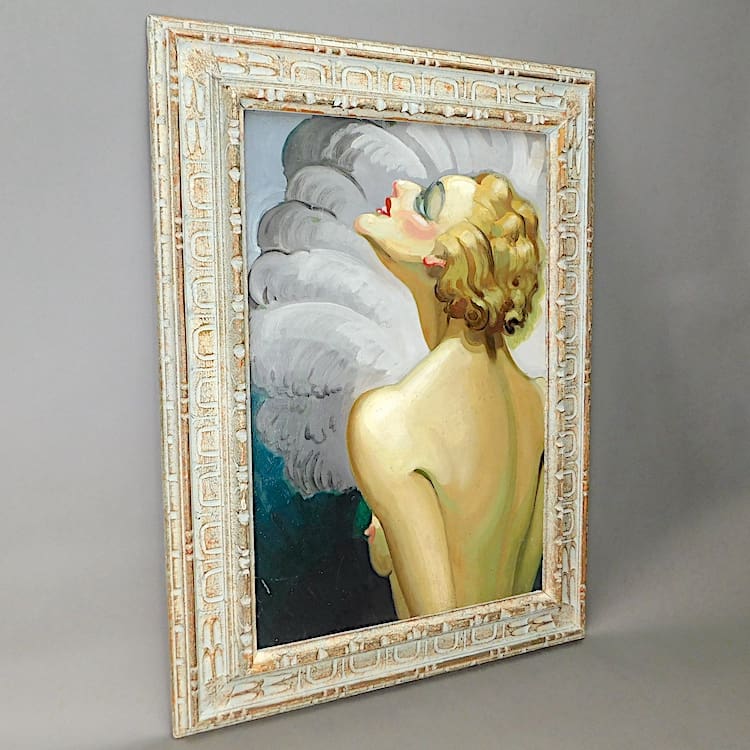 An oil on panel of a young Folies Bergère dancer, naked girl with stage makeup in front of a large feather fan.