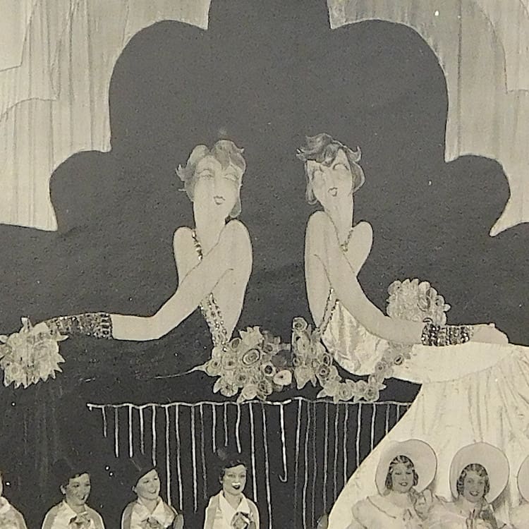 Original French art deco Folies Bergere photo dating to 1931, an important historical photo. It shows 2 large flapper ladies in the background scenery and to the front Tiller ladies in bonnets and ladies in top hat and tails. Stamped to the back Photography Walery.
