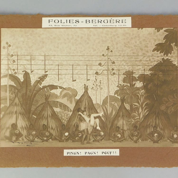 An original Art Deco photograph of a Folies Bergere theatrical performance during the 1930s. This is an official photo by Walery and it is certified with a stamp to the back – Photographie Walery and signature to the front – Walery, Paris. He was an official photographer for the Folies Bergere. This photograph is of a performance titled Pingn! Pagn! Pouf!! and has a title bar for the Folies Bergere to the top. The backdrop shows straw huts and musical notes and to the front is a lady in grass skirt dancing with a native and a number of native drummers.