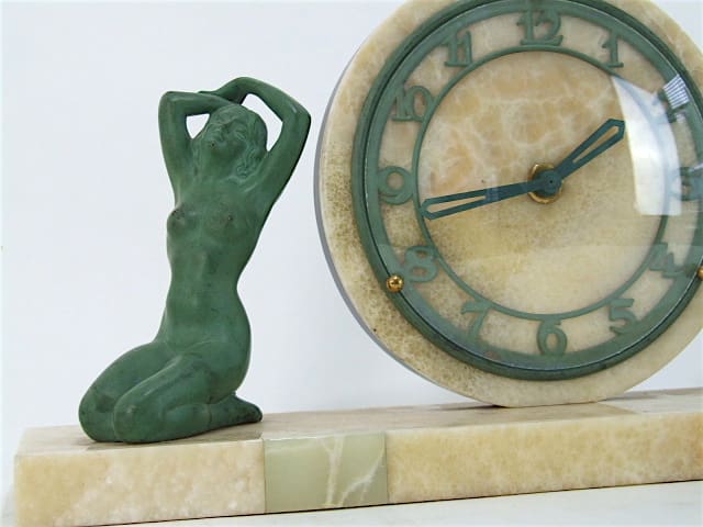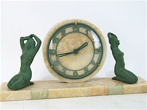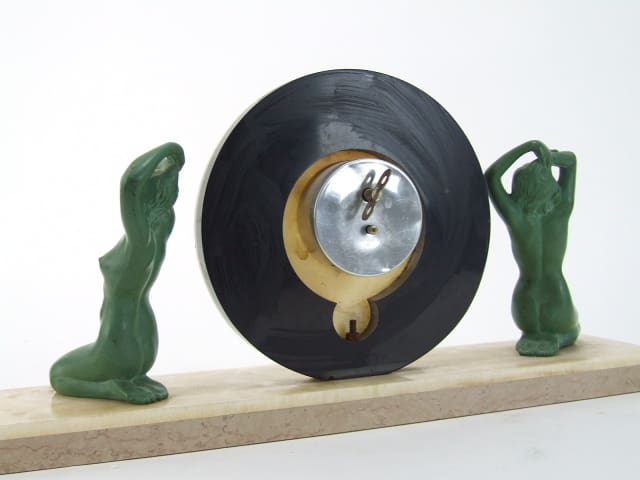 French, green patinated spelter nude ladies on a marble base either side of a clock. Unsigned but the statues are definitely by M. Font.