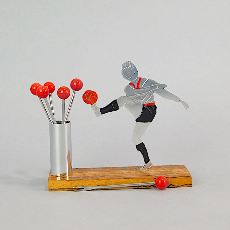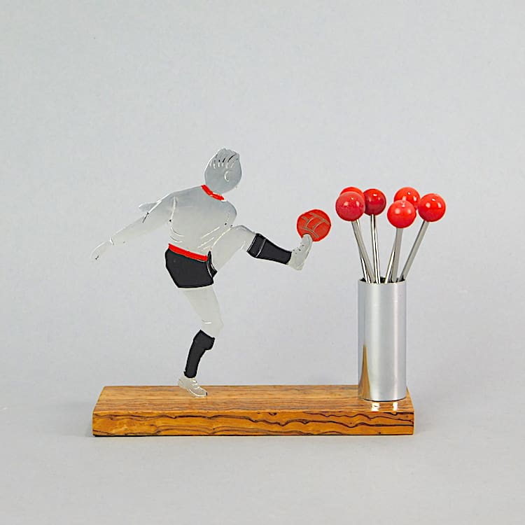 French art deco 2-dimensional footballer cocktail sticks set. Made by Sudre but this one unsigned. The red balls in the pot are the cocktail sticks. Mounted on a tiger wood base.