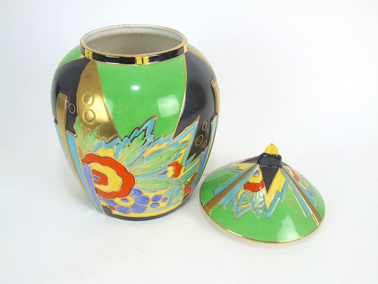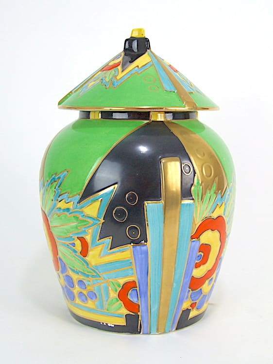 Rare large English art deco ceramic Ginger Jar in the Syrian pattern, made by Thomas Forester. Beautifully hand painted in vivid art deco patterning and rare colour way. Marked to the base Syrian, T F and S made in England and Phoenix.
