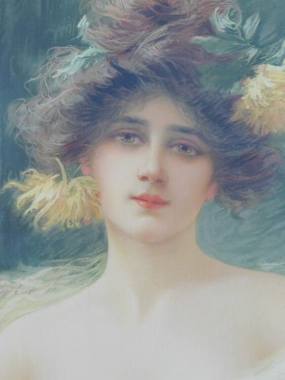 French art nouveau artists proof, signed Frederique Valley Bisson (1862-1949, b. Amiens). Mounted in its original frame, to the bottom of the work is the original colour palette. A hand finished Point Feche (dry point etching). Epreuve d’artiste. Possibly a printers proof due to the artists pallet at the bottom.
