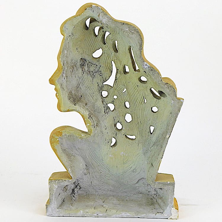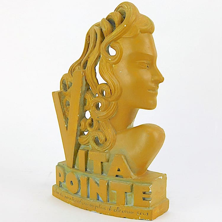 French Art Deco advertising mannequin bust. Vita Pointe advert advertising no more dry hair. (Plus de ninths abnees plus decheveux secs) or something similar – its difficult to read. Presumably originally from a hair salon.