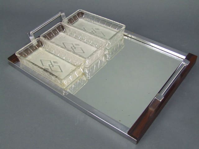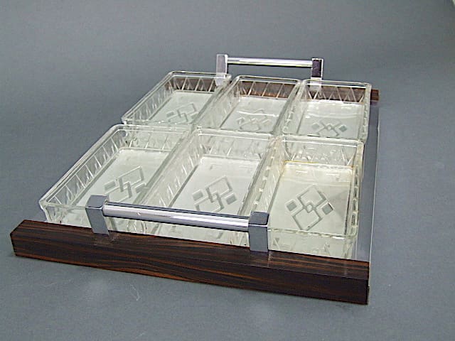Quality French art deco aperitif set with mirror glass bottom tray with macassar handles and six frosted glass server dishes.