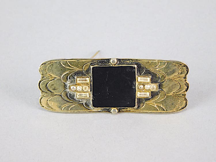 Black enamel and Diamonte bar brooch. Fitted with a roll safety clasp.