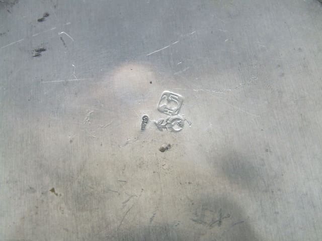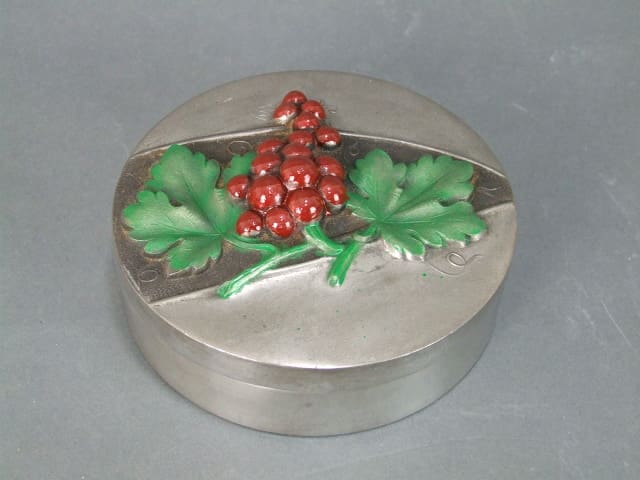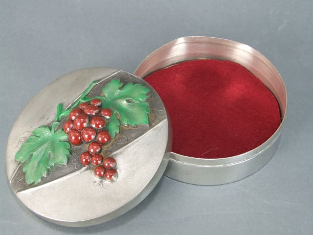 French art deco pewter jewellery box with enamel grapes detail to the lid, initialled RM to the lid. Inside there is a red felt liner to the base.
