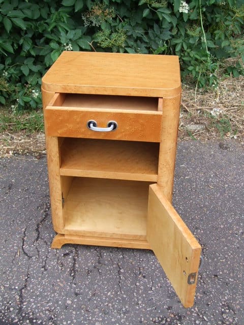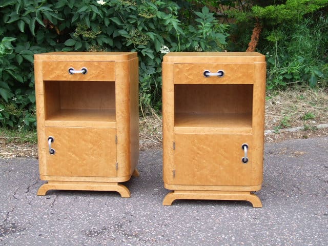 A pair of stylish French blonde Carolean birch bedside cabinets. Each has a drawer above a cupboard and have matching art deco metal handles.