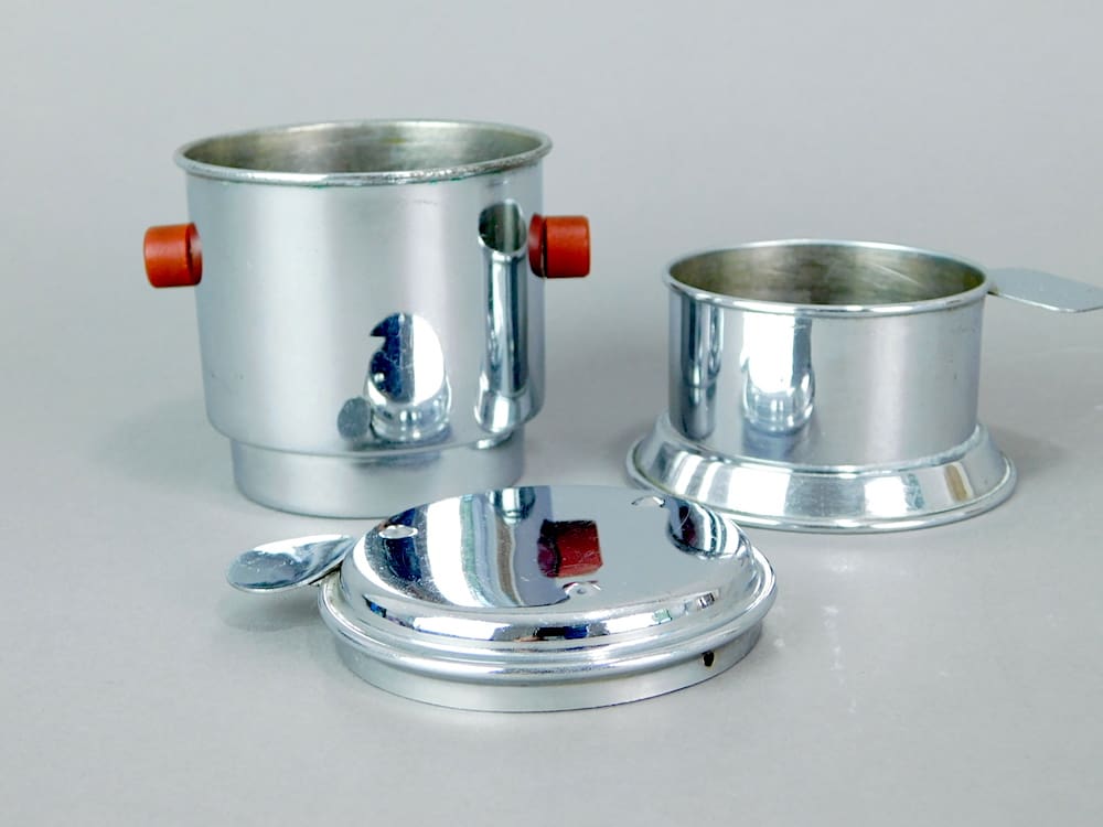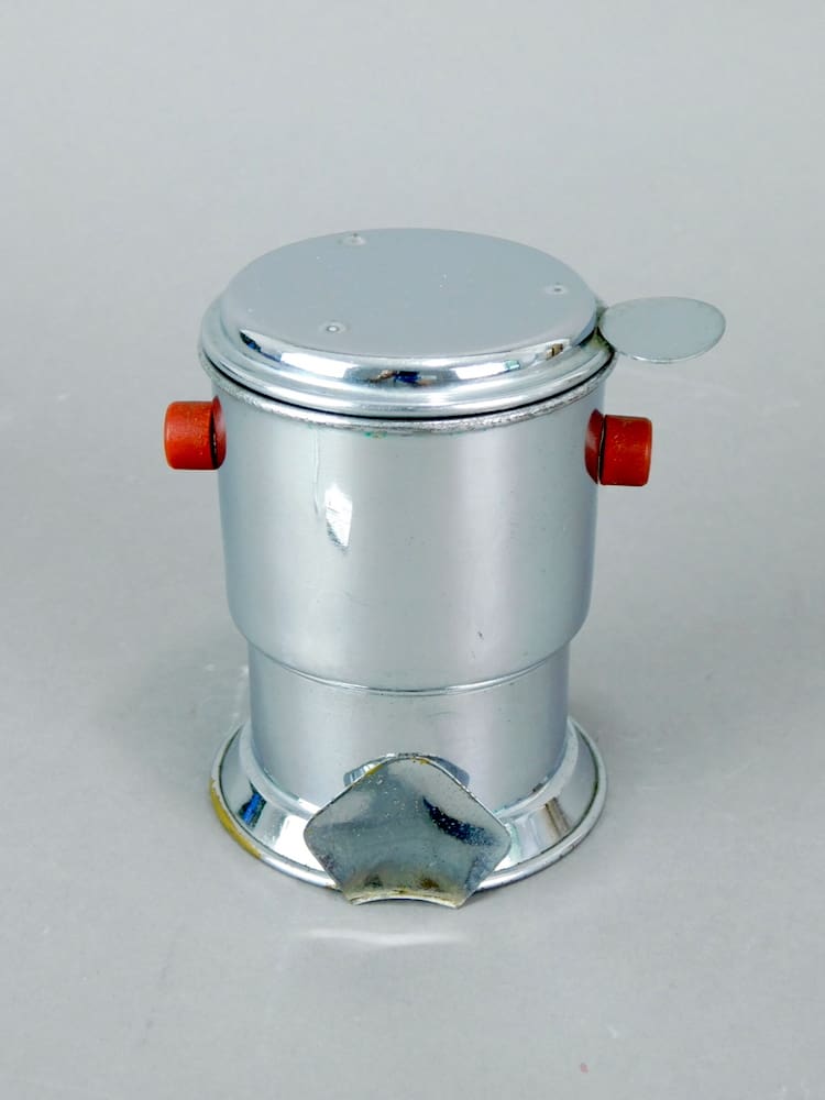 A pair of original French art deco chrome and galalith restaurant coffee cafetieres with red galalith handles.