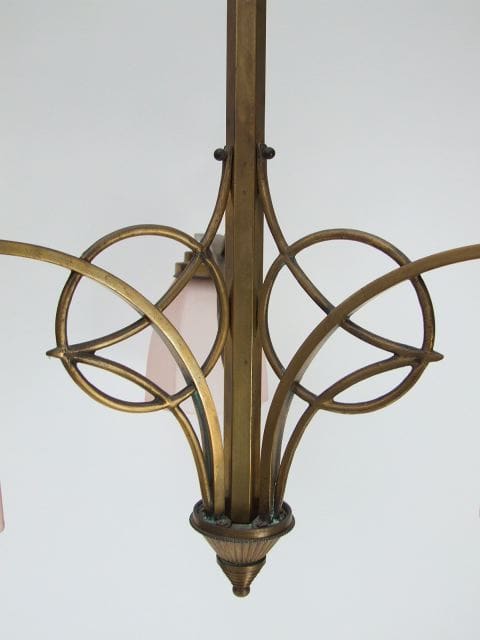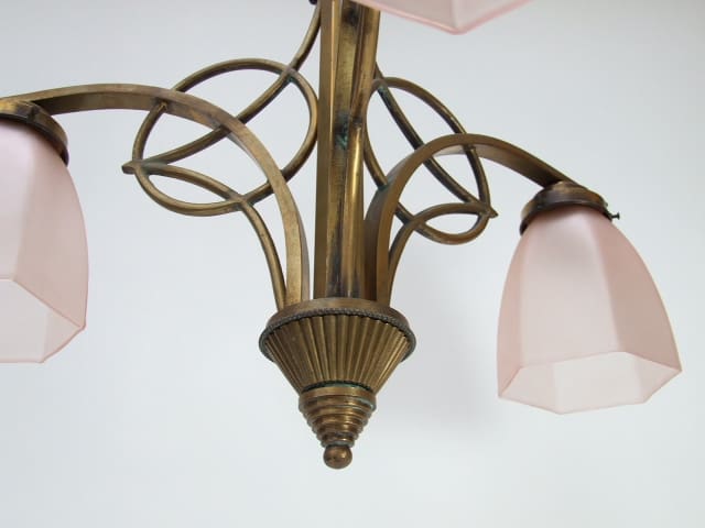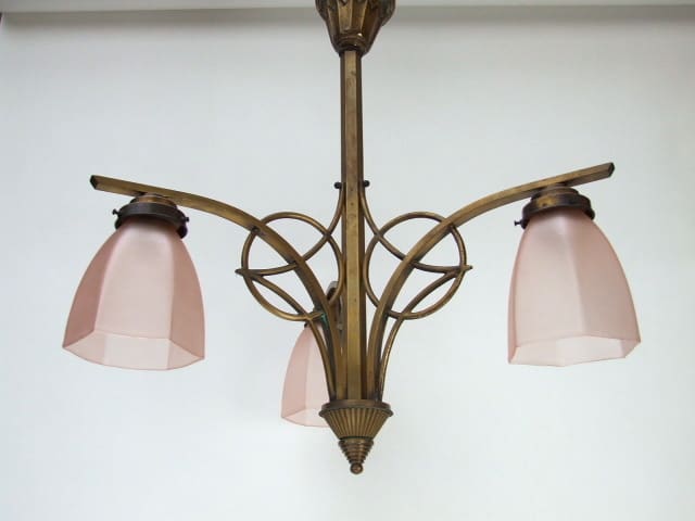 A French art deco 3-arm, gold patinated metal (possibly bronze) chandelier with peach glass shades. Circle detail to the main shaft and more detailing on bottom finial and ceiling socle. Original chain included.