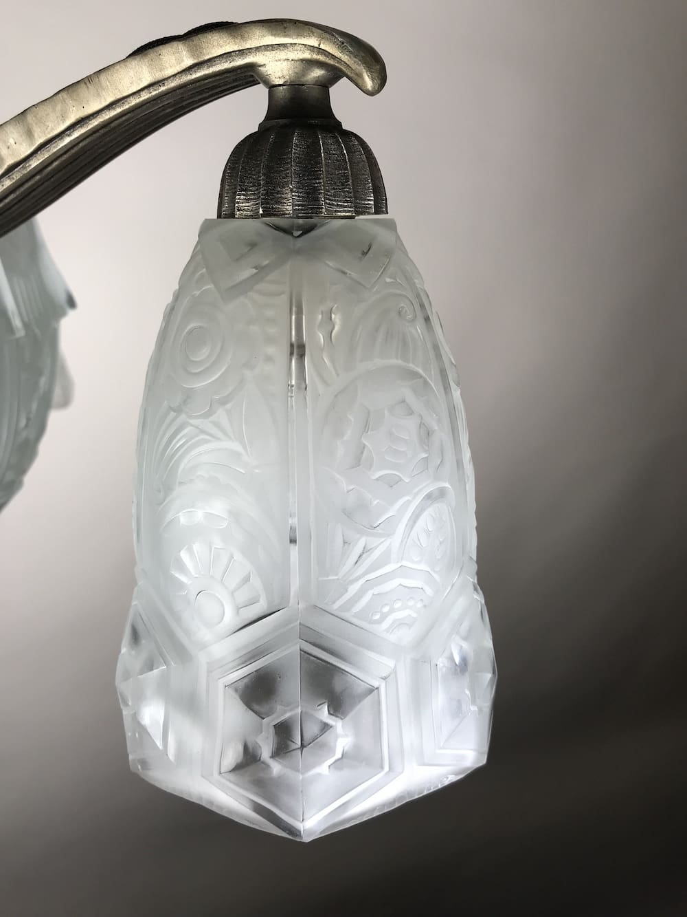 French art deco press molded top quality ceiling lamp by either Hettier and Vincent or Degue, but apparently unsigned. Frosted glass with stylised foliate detail. Central bowl with 3 bronze arms each with the matching glass shade. Silvered bronze rose and arms. Height is adjustable.