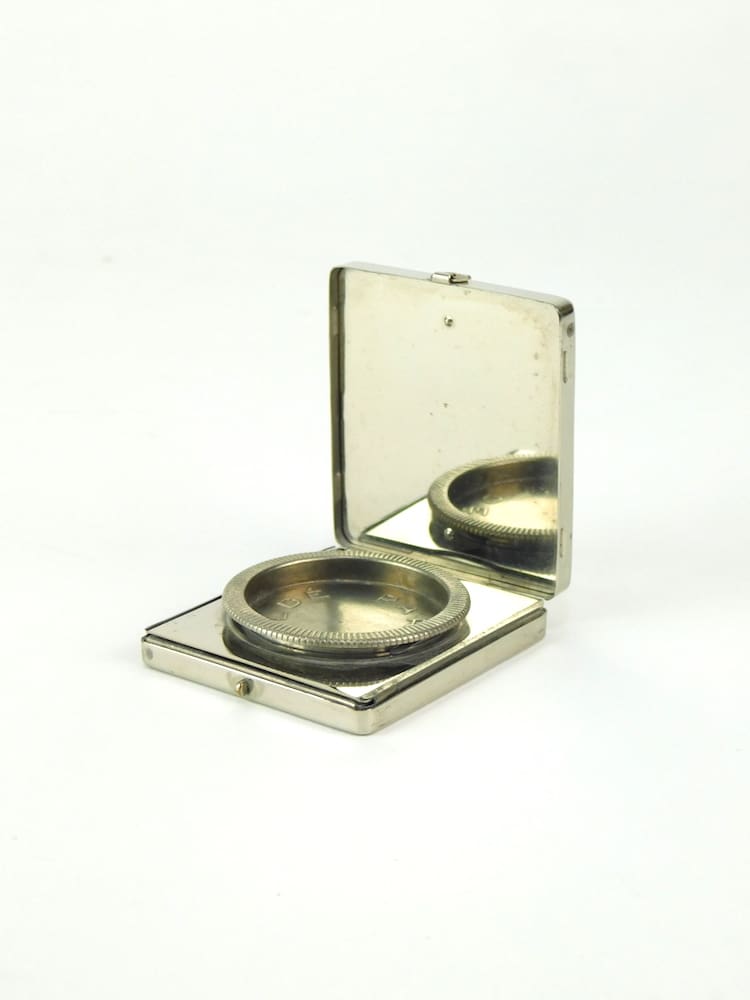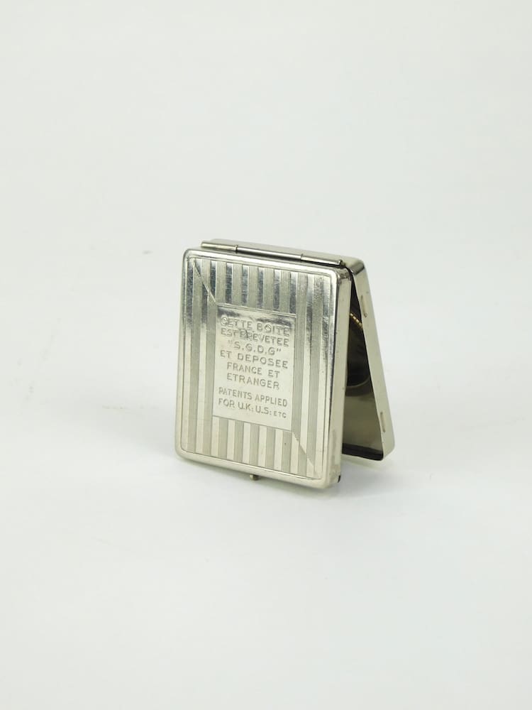 French art deco powder compact by Nilde Paris. Signed inside the lid with a reflective inner lid. The back reads Cette Boîte Est Brevetee.