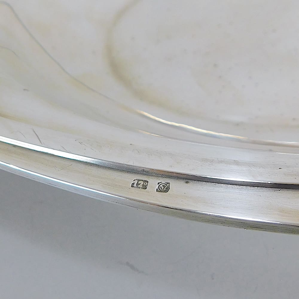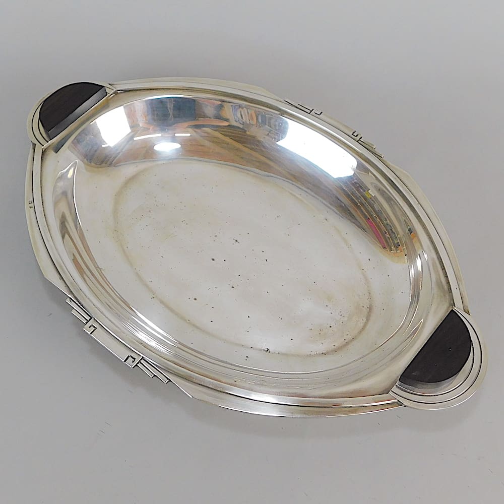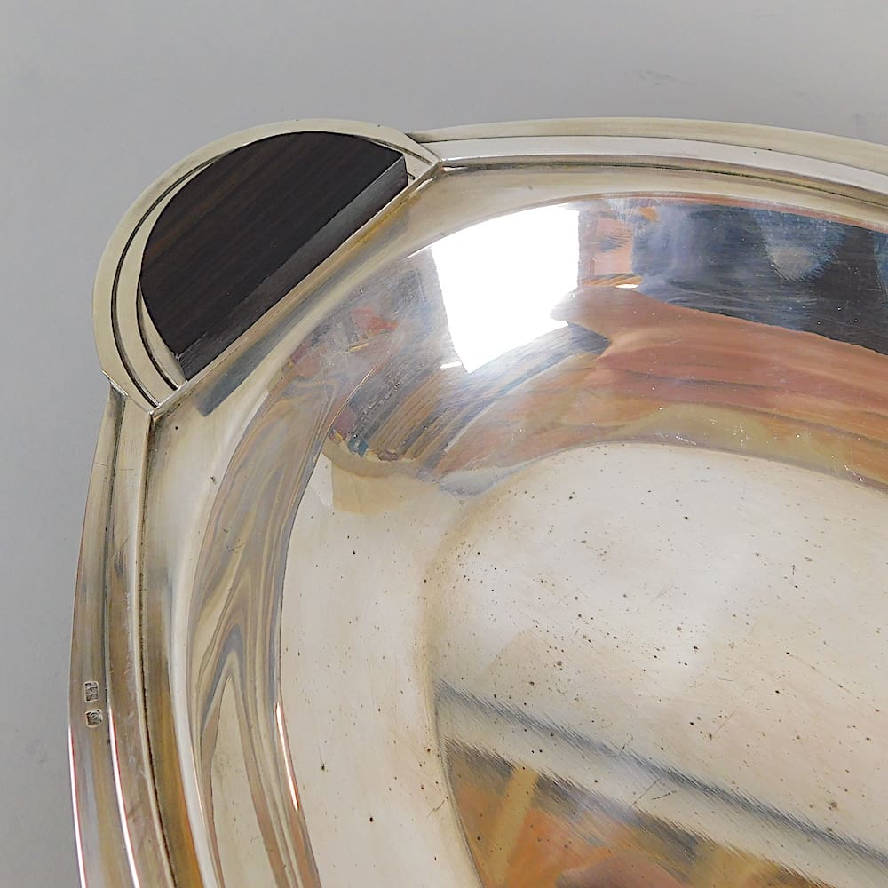 Silver plated fruit dish with macassar handles and stepped key side detailing.