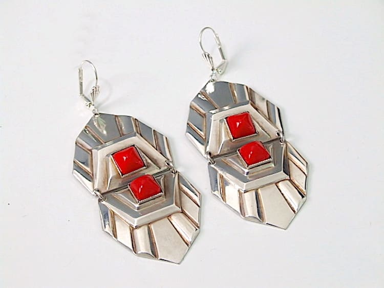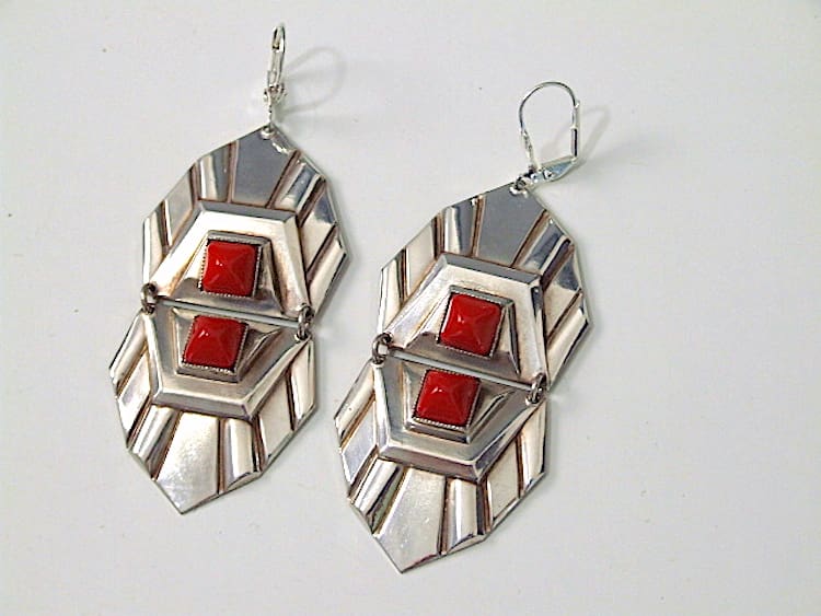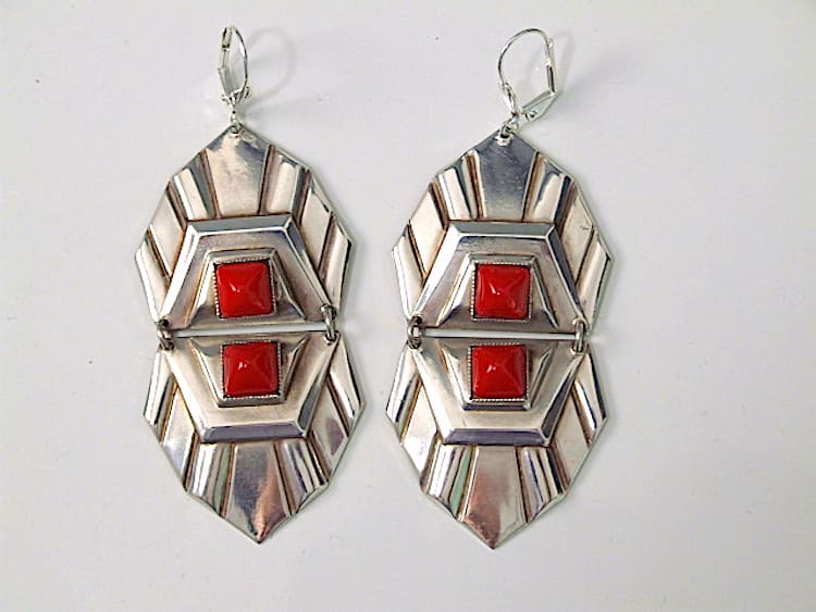 French silver plated geometric earrings with red onyx stones. They are made for pierced ears.