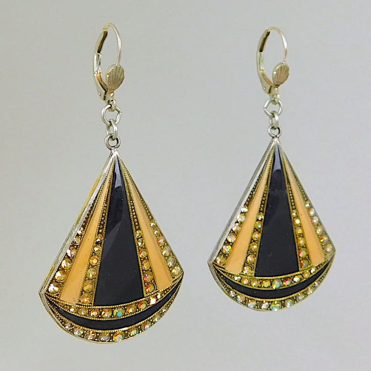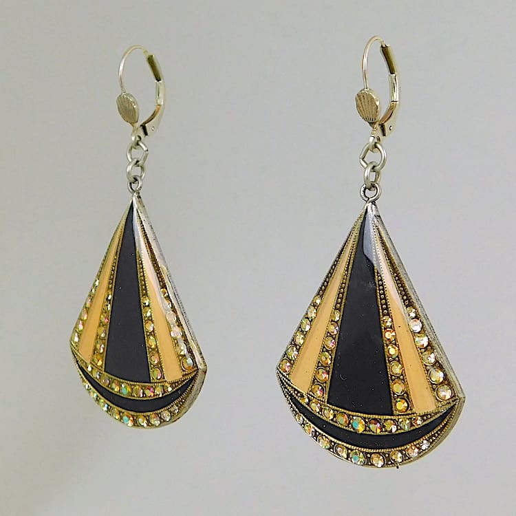 French enamel and diamonte fan earrings with clip fittings for pierced ears.
