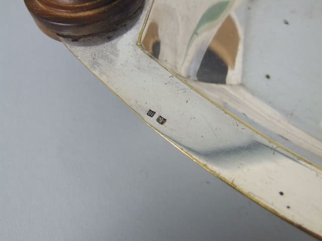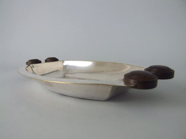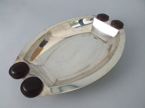 A fine quality French nickel plated modernist fruit bowl with circular macassar ebony handles.