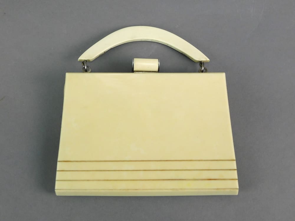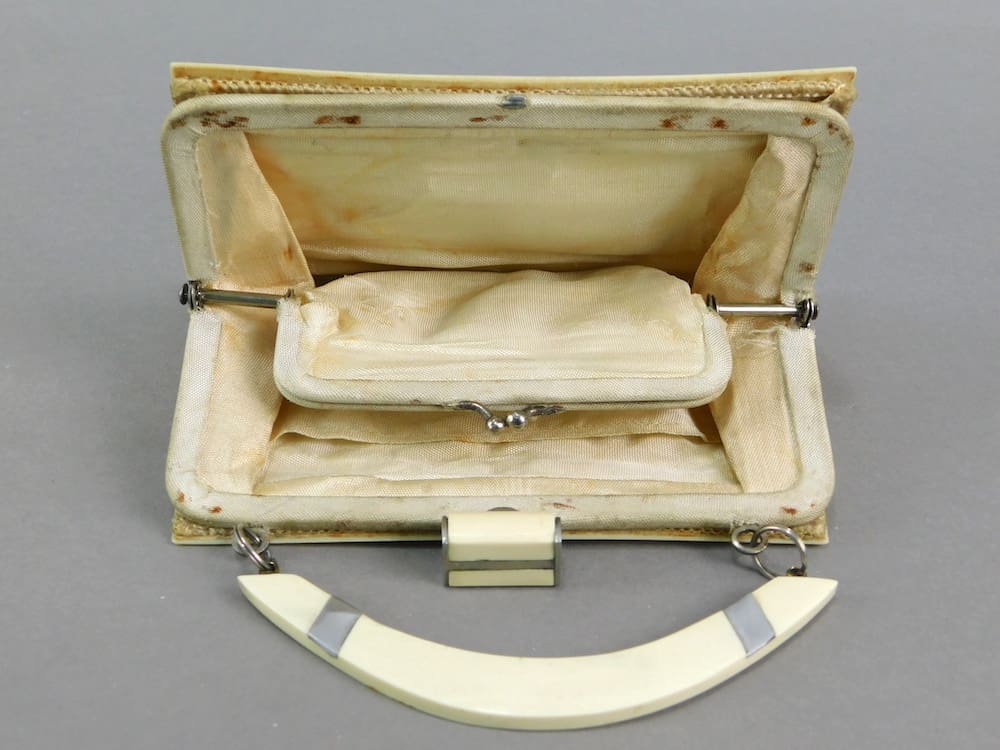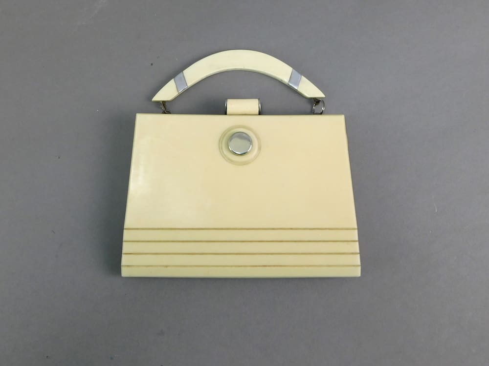 French cream phenolic and chrome modernist handbag. It is lined in silk with a central purse section.