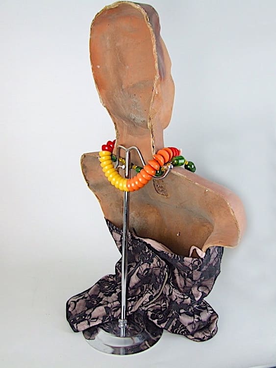 French art deco mannequin made in the 1920s of papier-mache – amazing it has survived all these years. Missing her original stand, although I have her proped against a metal one that I will give with her. She is not sold with any clothes or jewellery.