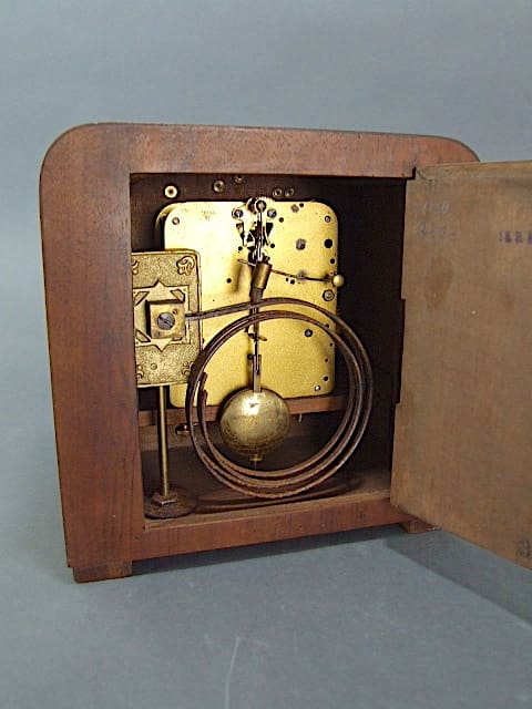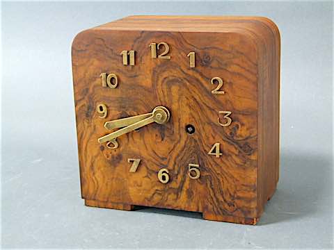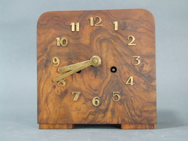 French walnut mantle clock with gilt metal hands and numerals.