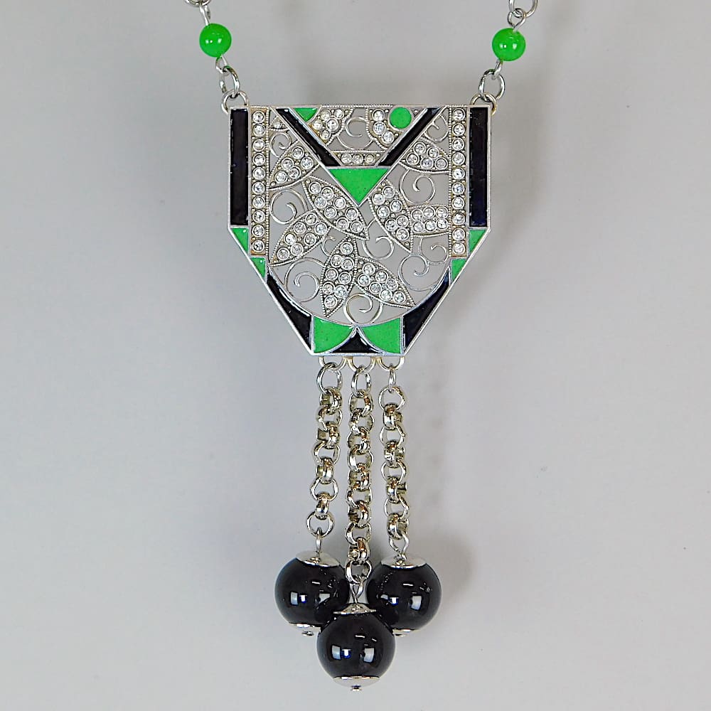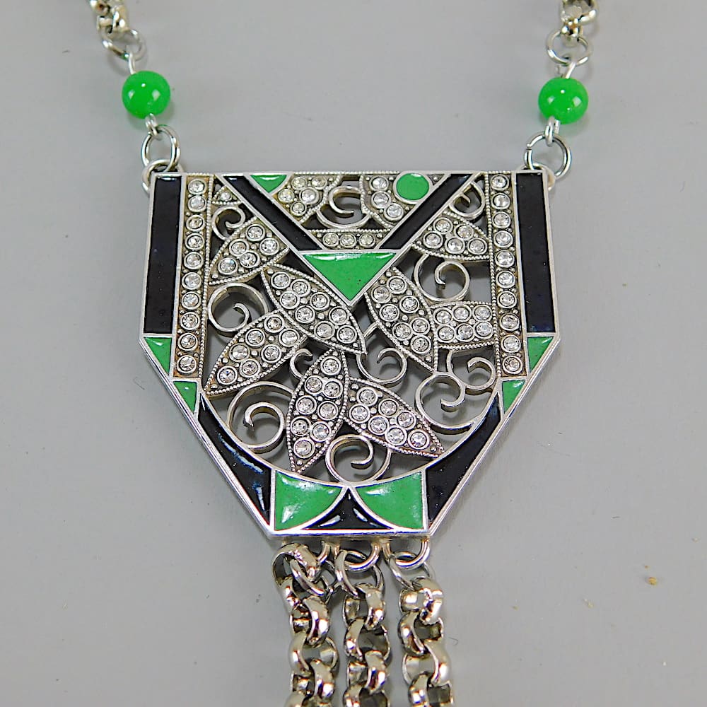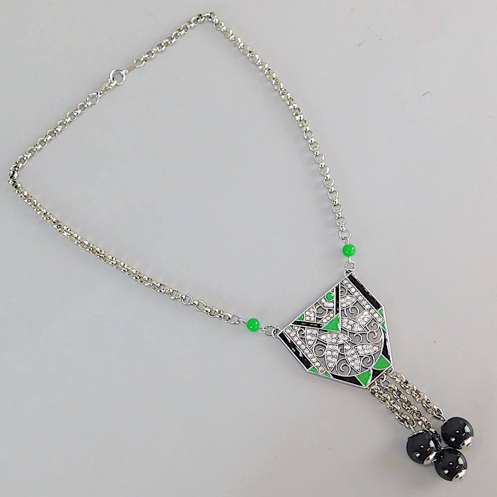 Silver plated and enamel leaf necklace with diamonte detailing and phenolic beads.