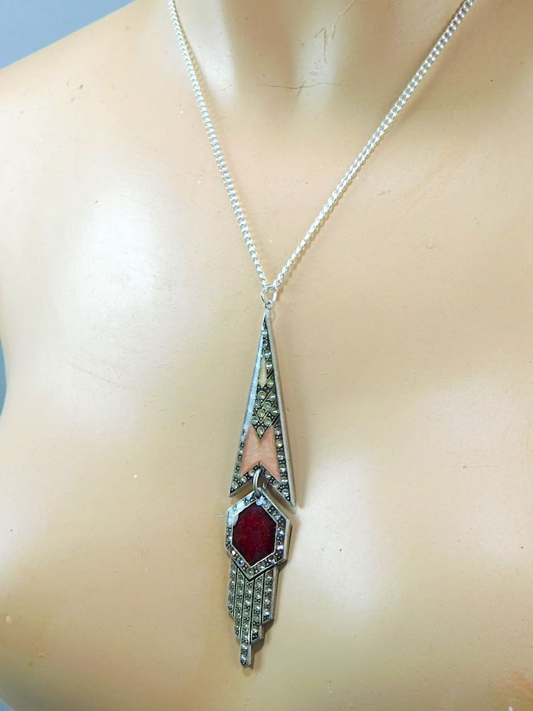 French art deco enamel fan necklace in pink and red enamel with rhinestone patterning. Made by Pierre Bex, Paris.