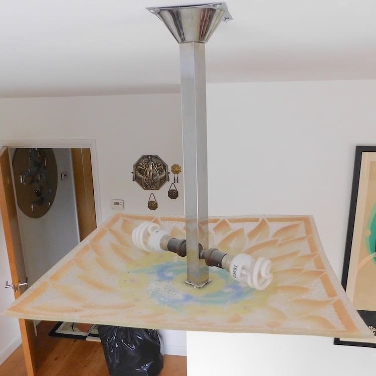 French art deco ceiling lamp in Loys Lucha style. Vividly hand painted glass in bright colours signed indistinctly E.G and suspended on a chrome column with a square ceiling rose.