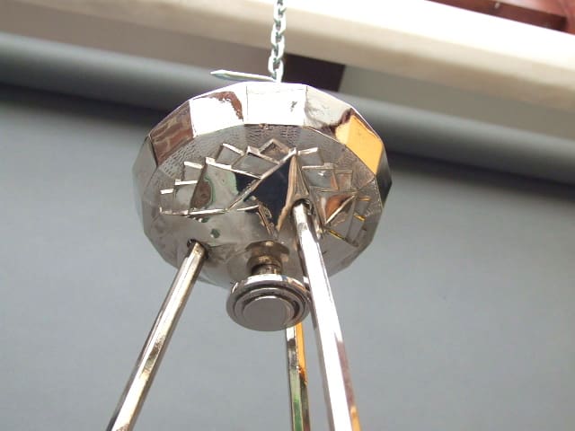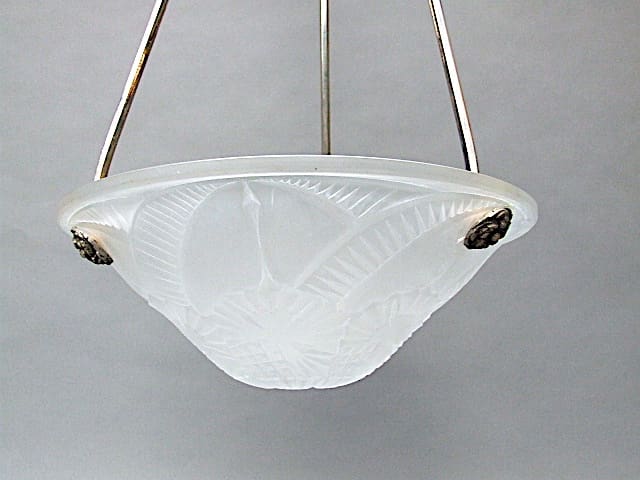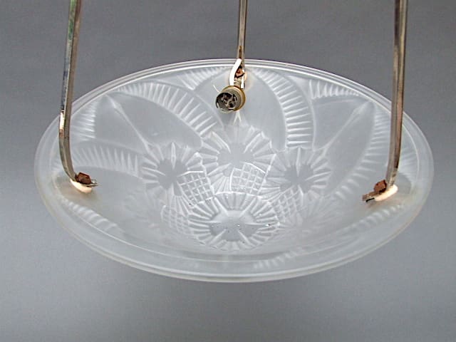 A Muller Freres style chrome and frosted press moulded glass plafonnier. Made in the late 1920’s – early 1930’s. It has chromed bronze metal sections and a thick glass bowl with stylised floral and leaf patterning to the glass. Art deco motif to the ceiling rose. A single bulb holder and wire runs down the inside of one of the side bars.