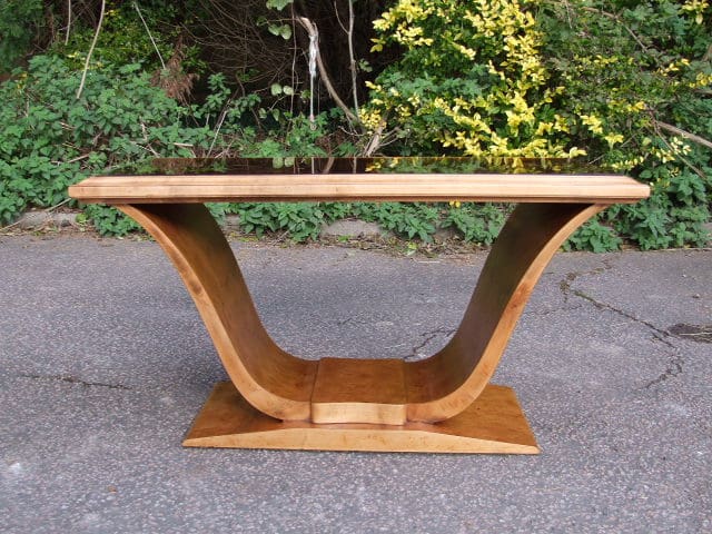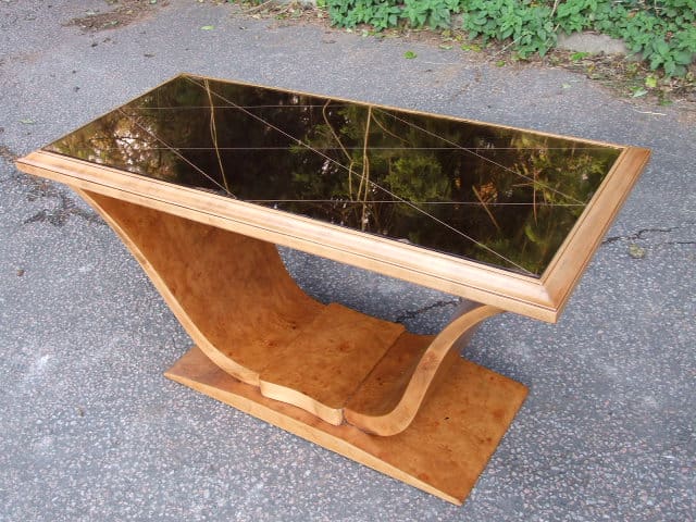 Stylish and very good quality French art deco burr walnut table. Crisscross etched lines in the peach glass top. Stylish moustache base. Maker unknown.