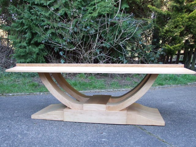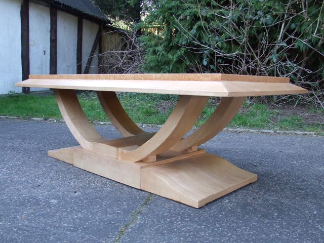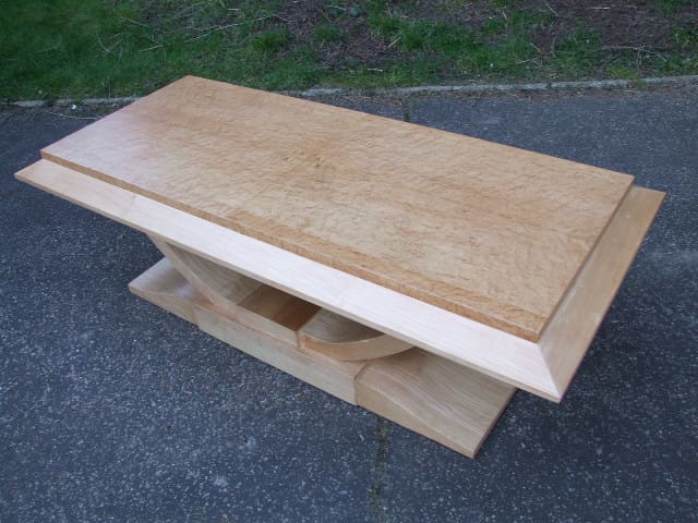 French modernist birds eye maple coffee table. With U flared base detail and birds eye maple quarter veneer to the top panel.