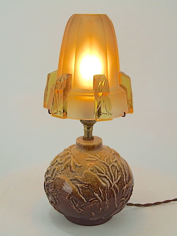 French terracotta table lamp with a leaping deer and brown glaze by Marcel Guillard stamped to the base and also bearing the Etling Foundry mark, Paris.
