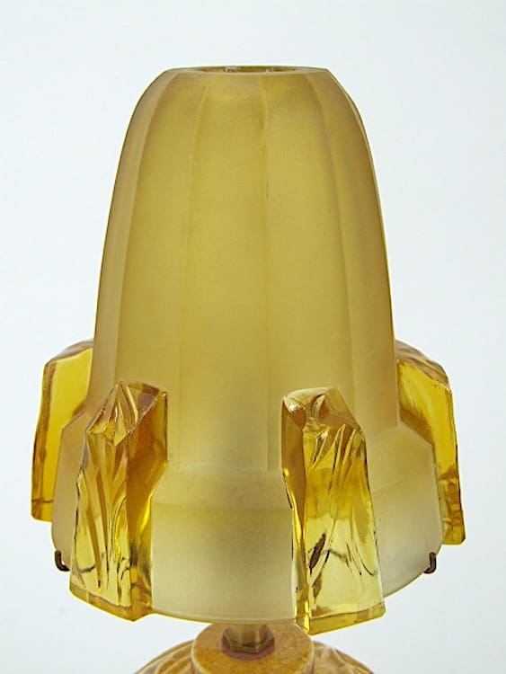 Fitted with original French thick amber glass shade and with on/off switch to the stem.