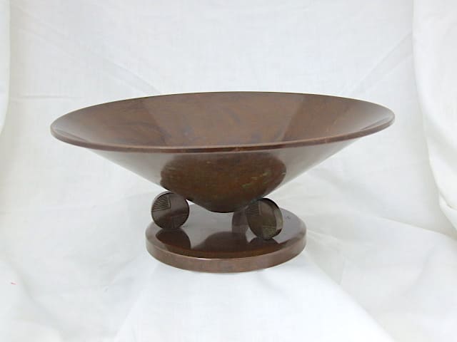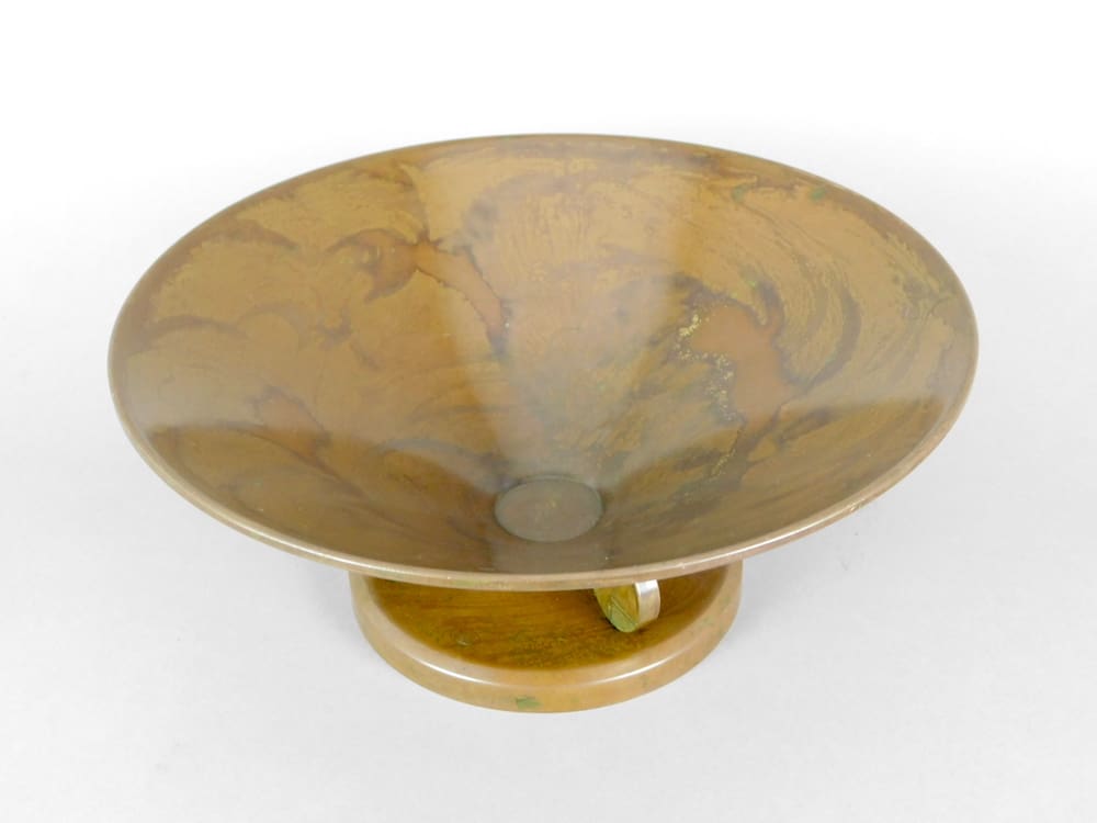 French modernist metal fruit bowl on circular geometric patterned stem.