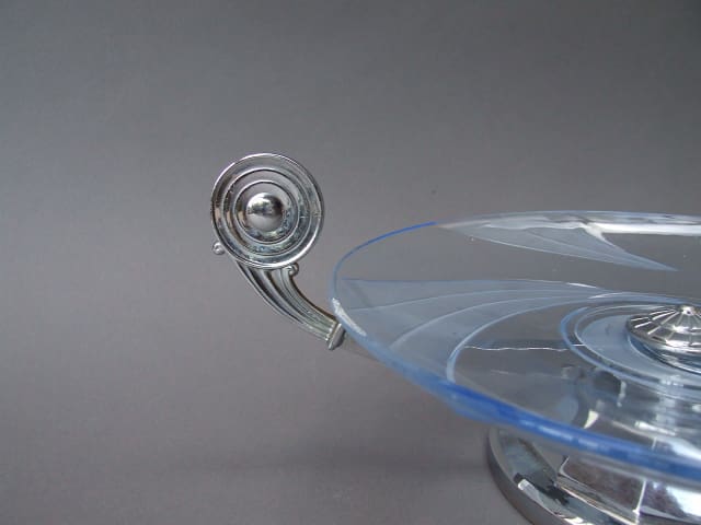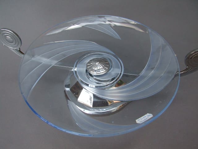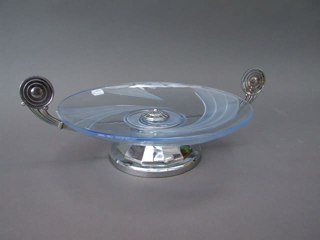 French glue glass and chrome tazza or fruit dish. Frosted swirl design to the glass. Mounted on a faceted base.
