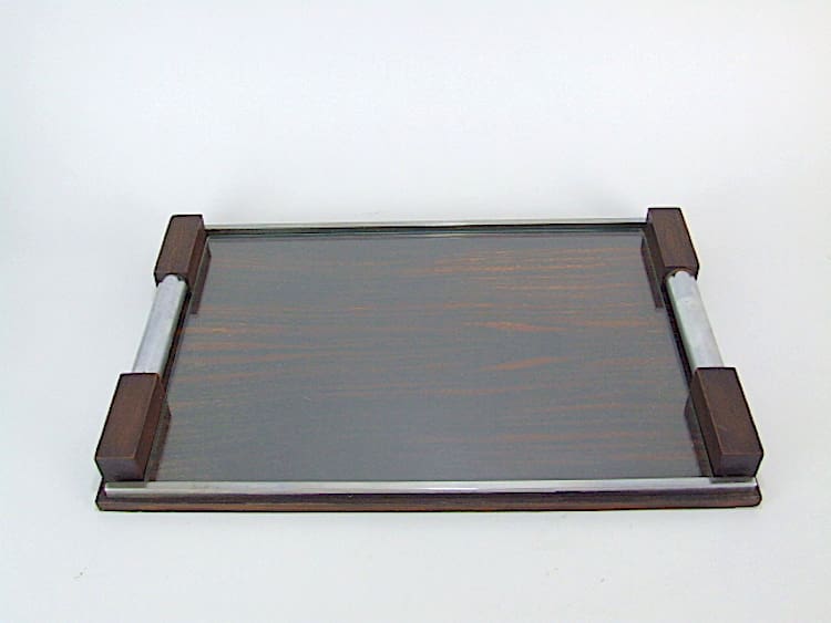 Top quality and heavy rosewood tray with chromed metal roll handles. The base is covered in a glass panel.