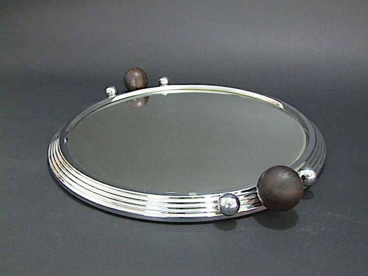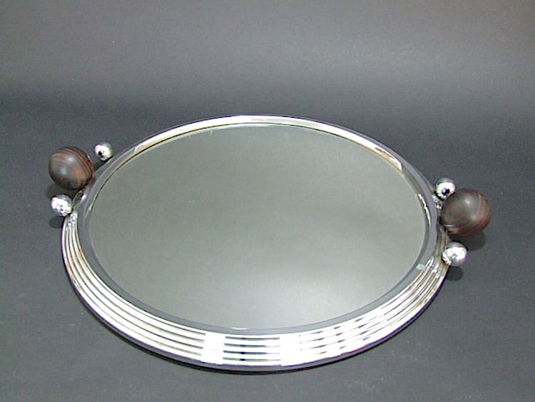 The mirror bottomed tray has a stepped silver metal outer ring and two macassar ebony ball handles flanked with a pair of smaller silvered metal balls.