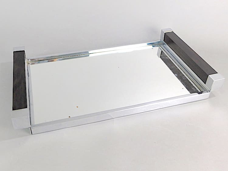 Large Macassar and chrome tray with mirror glass base.