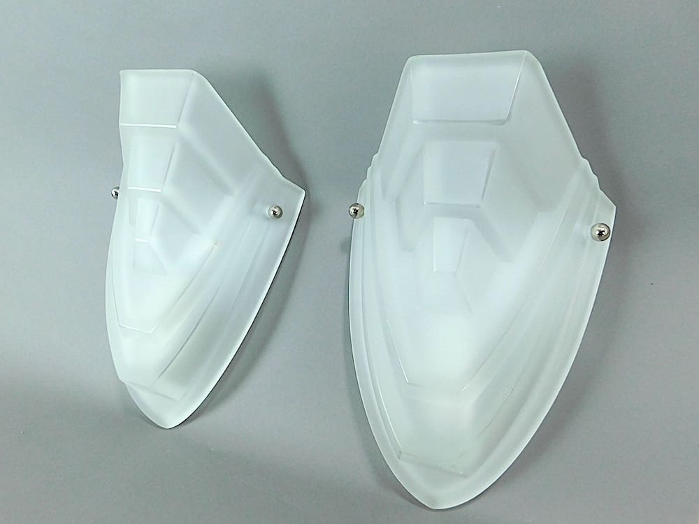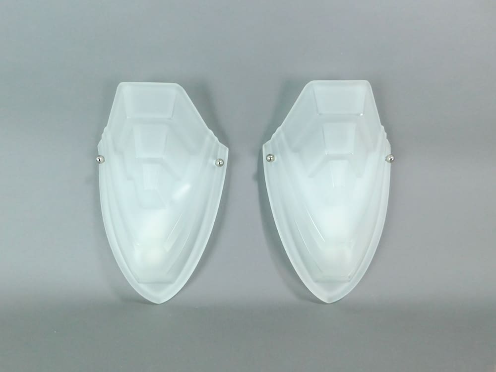 French modernist wall lights. A pair of new frameless opaque glass wall lights, made from the original art deco moulds in the style of Degue. Very minimalist with just a silvered ball each side holding the glass to the back plate which houses a single SBC (small bayonet) bulb holder. The wiring is new and up to modern standards and ready for connection.