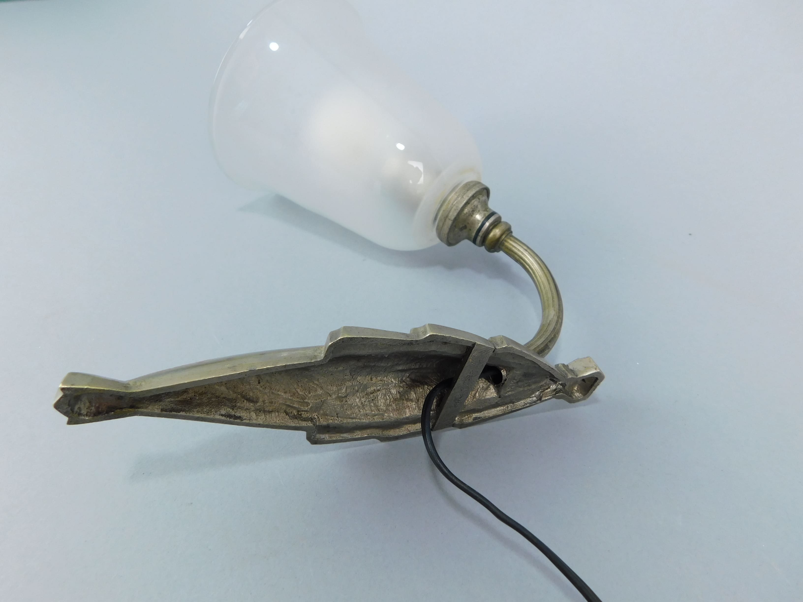 French bronze art deco single wall light with white glass shade and red enamel stylised floral detail.