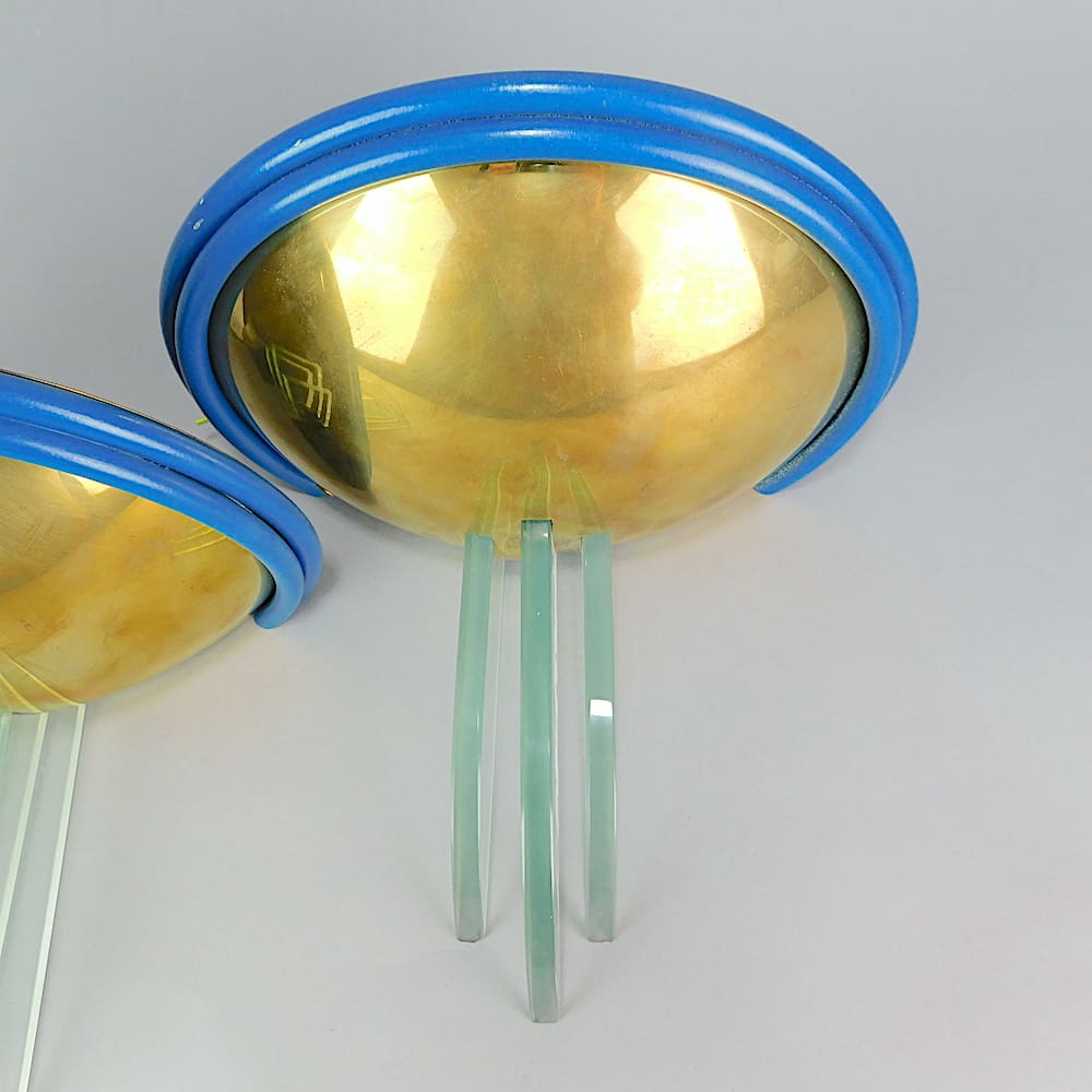 A pair of large French art deco wall lights. Gilt metal cups with vivid blue metal rims and thick glass shards to the bottom. The bowl is an uplighter and the light would echo down the glass shards.