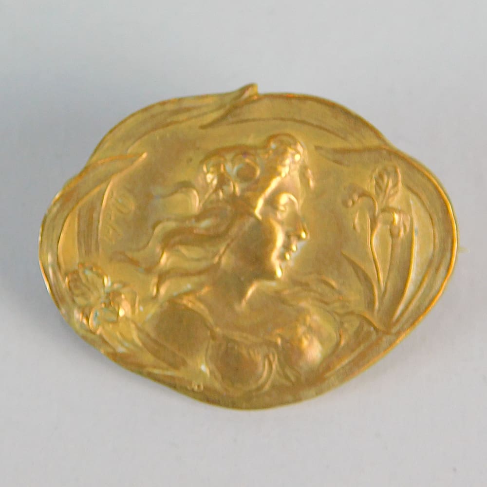 Good quality bronze brooch with the image of a beautiful maiden with flowers and foliage surrounding her.