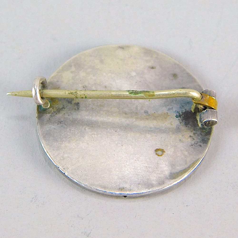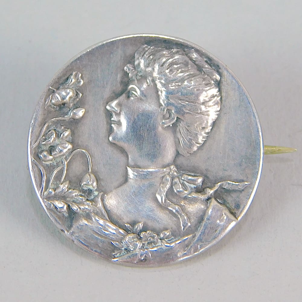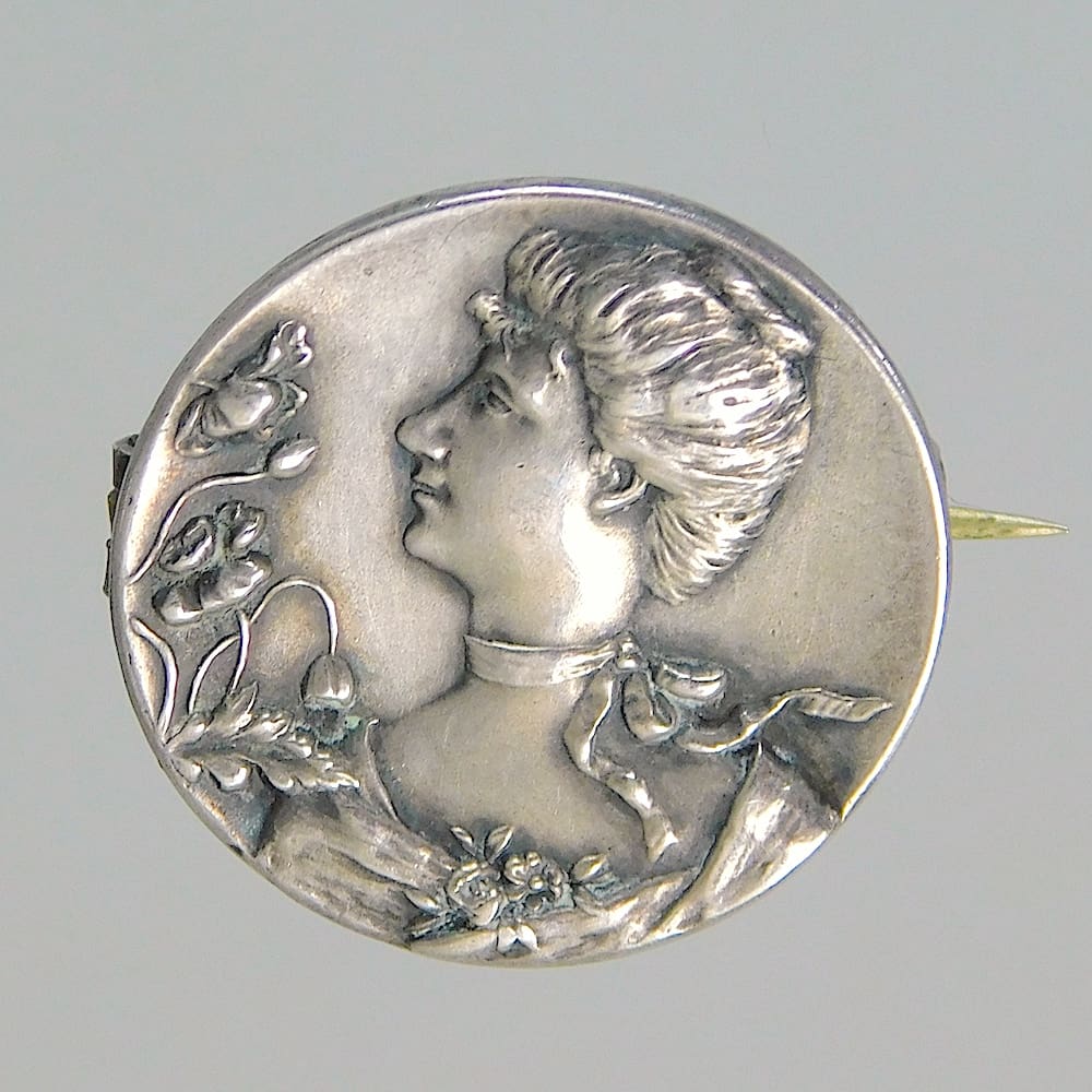 Small silver brooch with the image of a nouveau maiden with flowers and foliage.