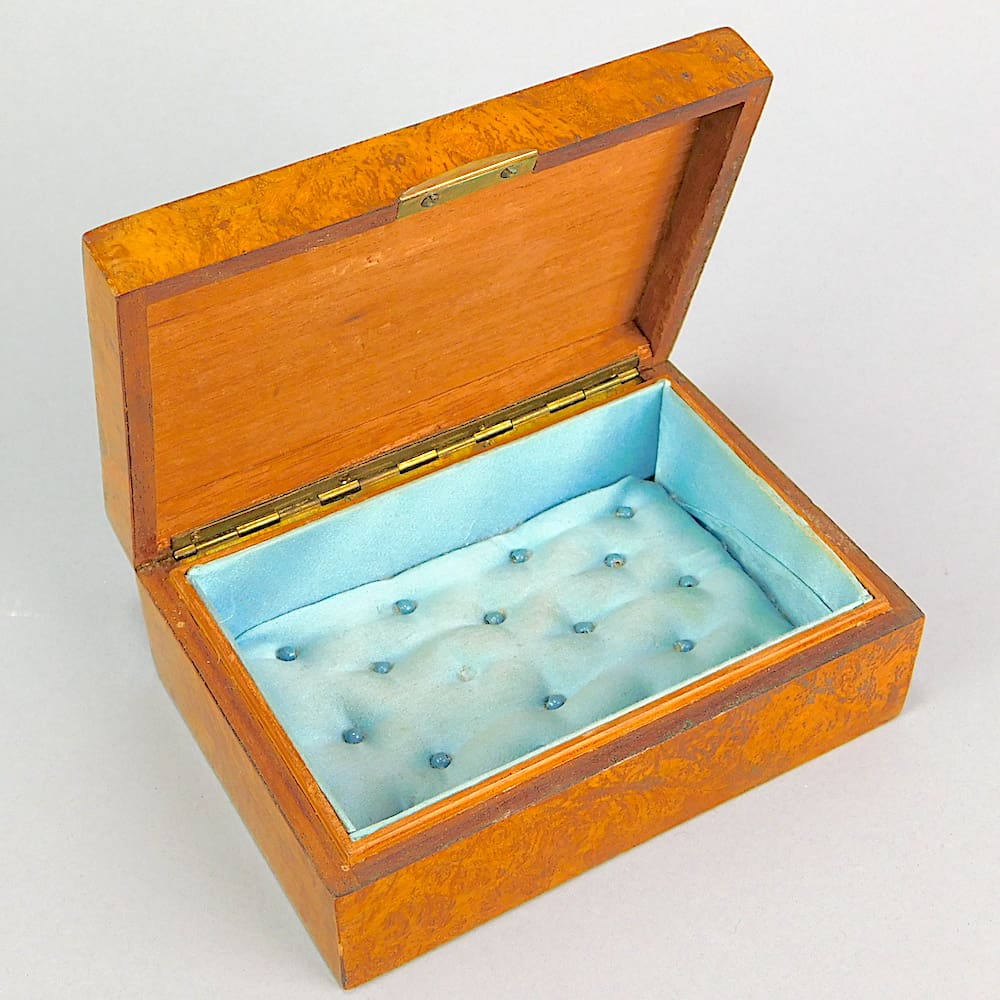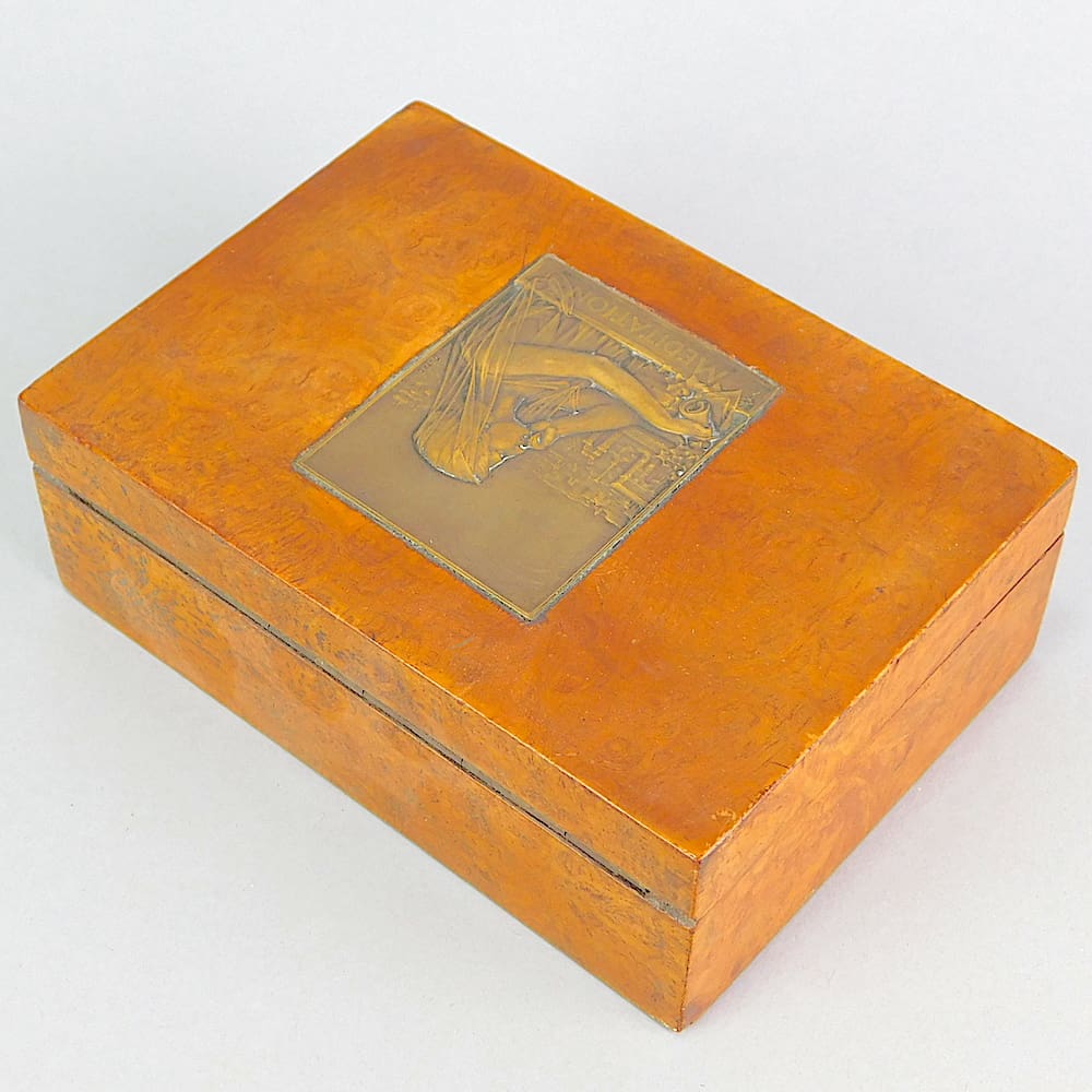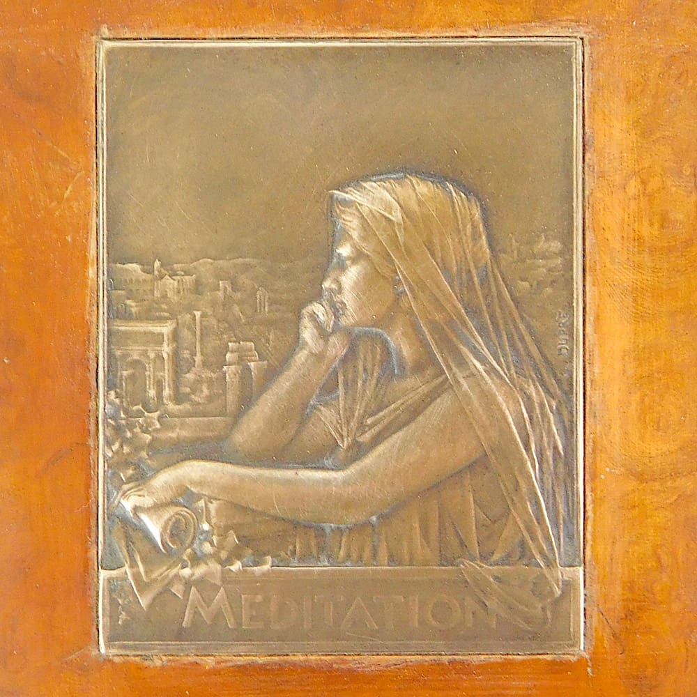 French art nouveau amboyne jewellery box with a central medal of a Nouveau lady holding a scroll with a view of Paris in the background and titled Meditation. The plaque is signed G. Dupre. Inside the box is lined in its original pale blue beaded satin material with just one bead missing.