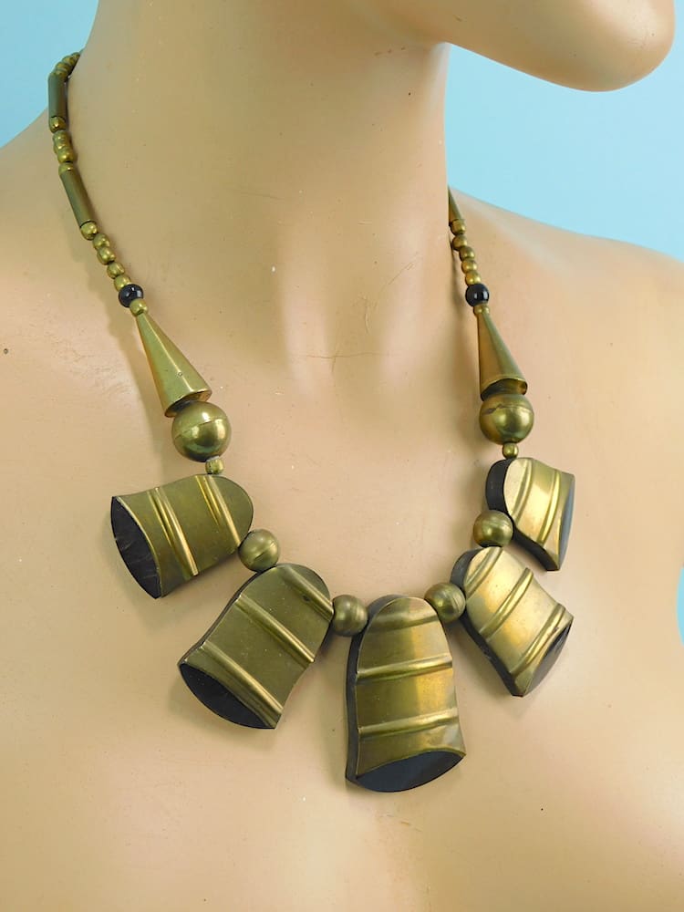 Huge brown, wood effect celluloid and brass bells necklace, made in France in the 1930s.