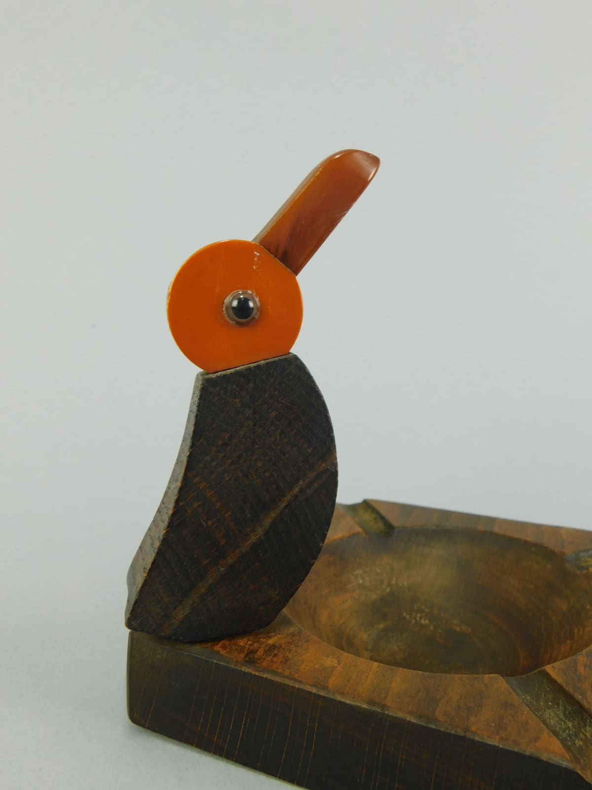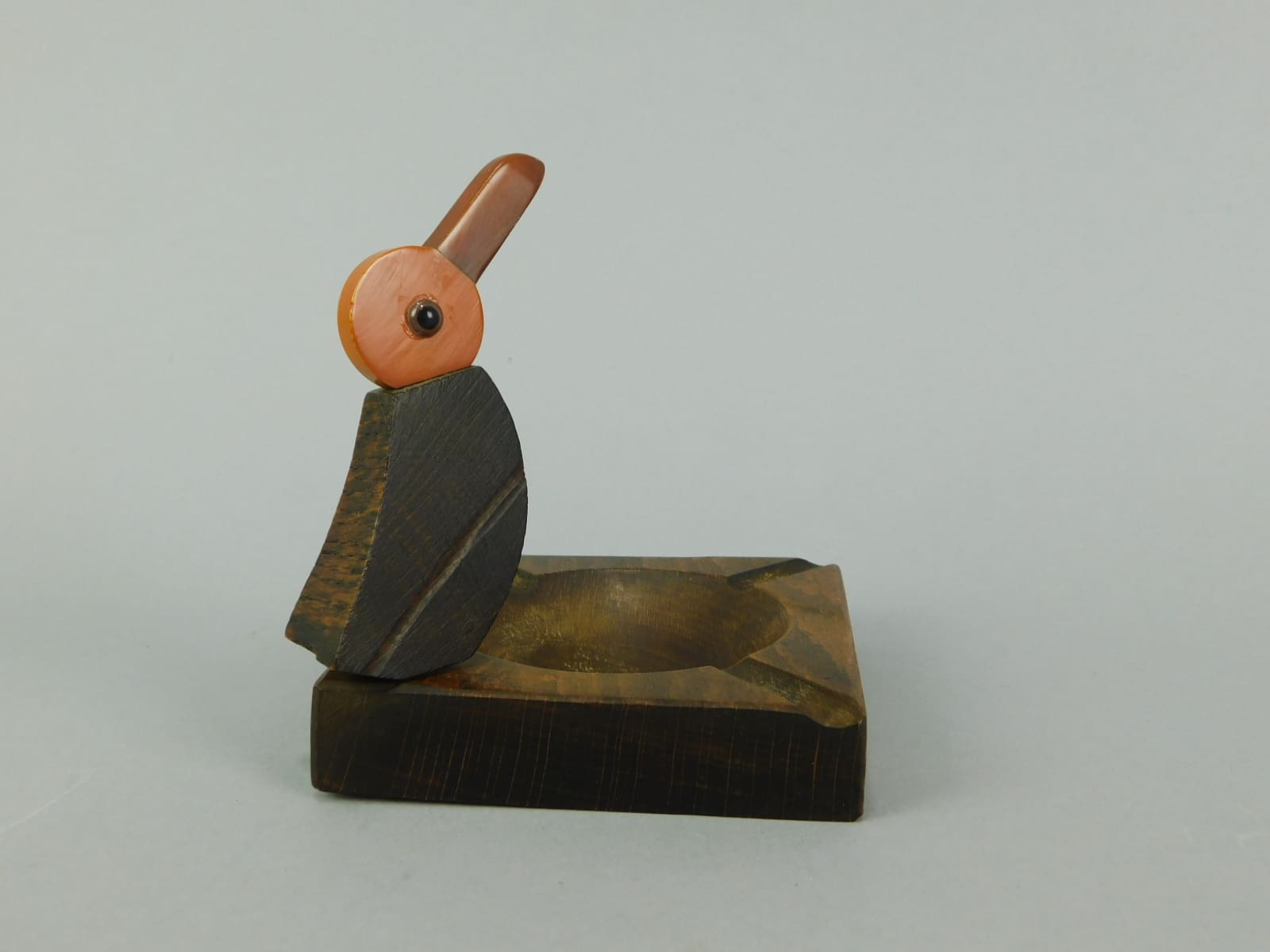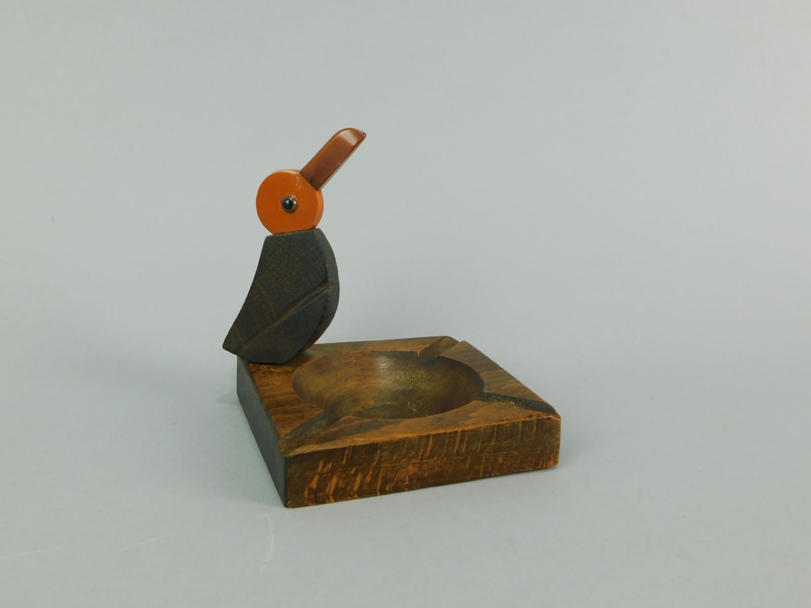 Hand carved art deco bird with a phenolic head and glass eyes. Mounted on a wooden ashtray base.