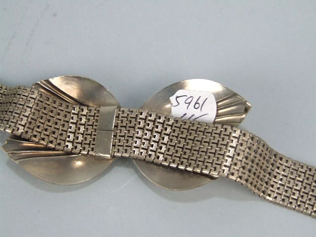 French bow bracelet, with mesh band and chrome bow with red enamel detailing.
