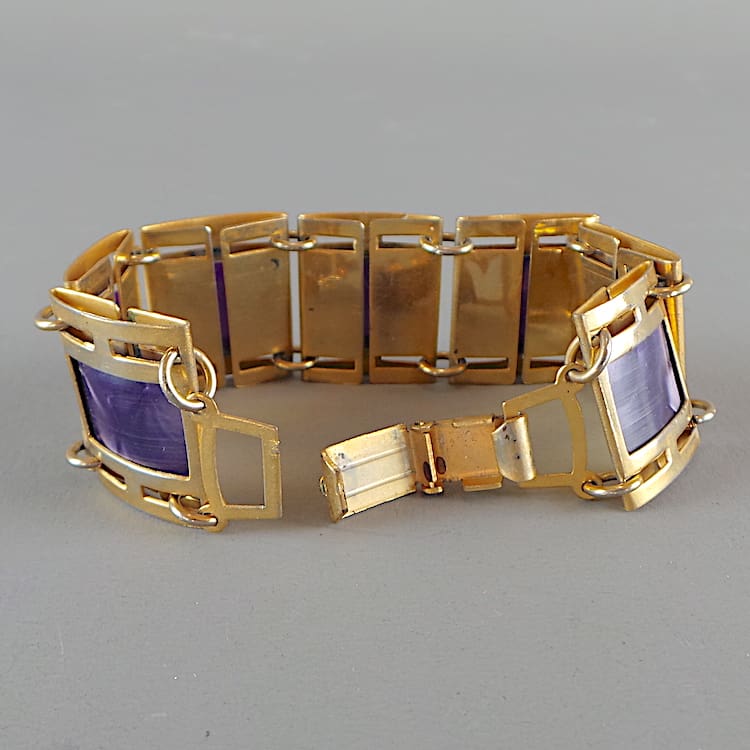 Gilt metal and pearlised purple bracelet.