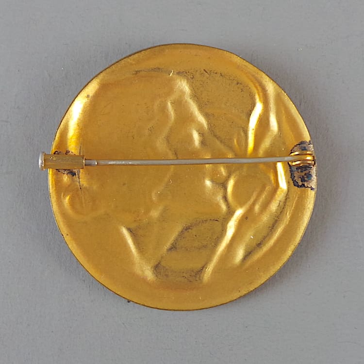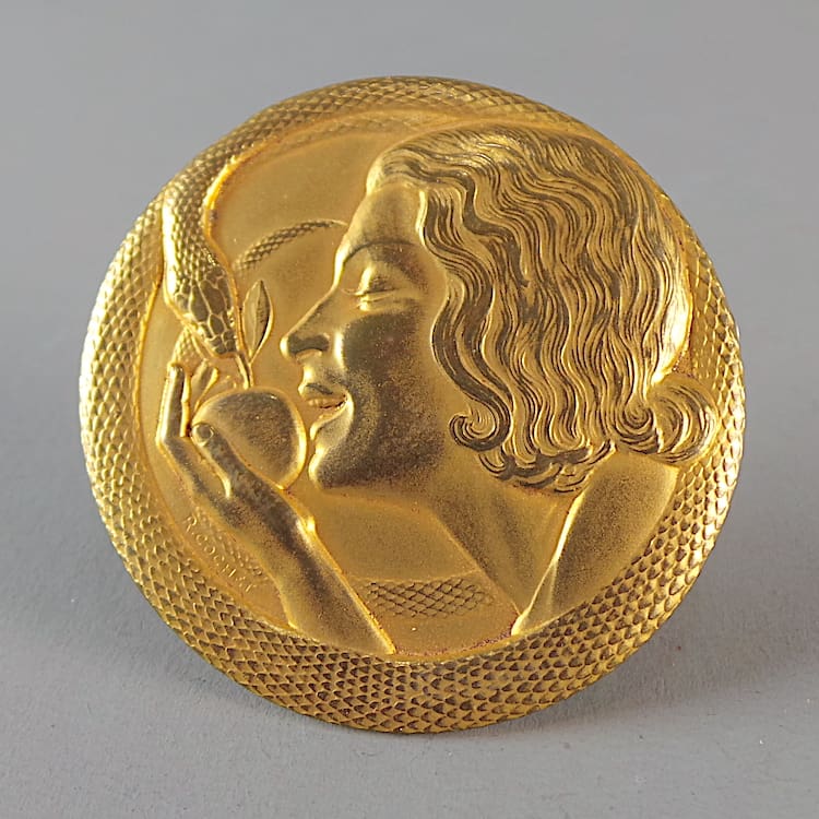 Gilt metal lady and snake brooch signed R. Cochet (one of the famous French medal makers). It is fitted with a slide safety clasp.