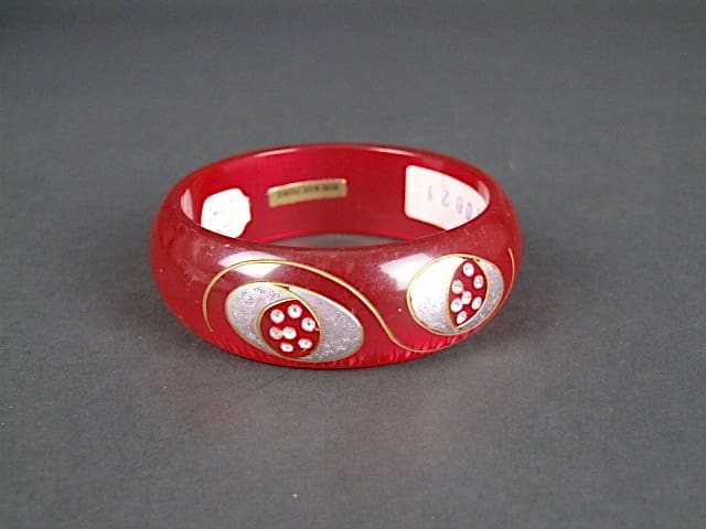 French lucite bangle, hand made in France in the 1930’s. Translucent red with silver glitter panels and central diamonte detail.